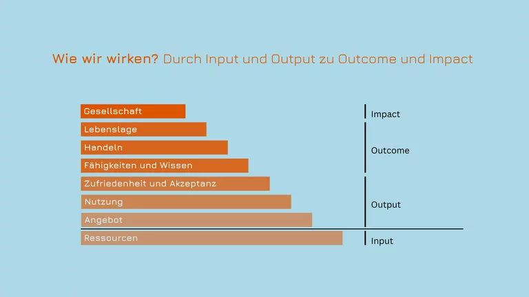 Wir orientieren uns in unserem kostenlosen Angebot an der Phineo Wirkungsmessung. Aufwändigere Workshop-Formate, Wirkungsberichte und Prozesse können diesen Wirkungsprozess ergänzen oder davon abweichen. https://www.phineo.org/uploads/Downloads/PHINEO_KURSBUCH_WIRKUNG.pdf